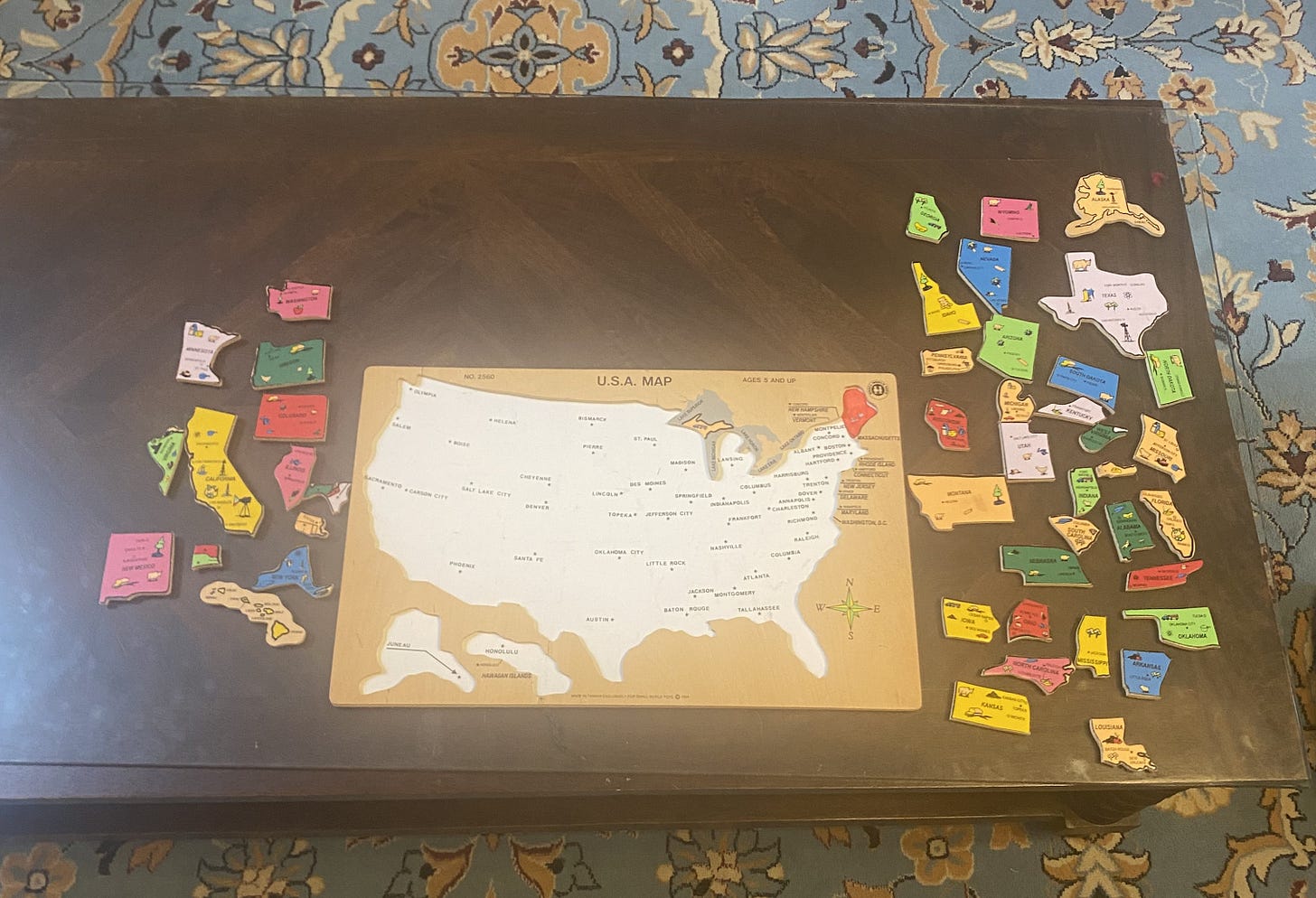 Take a look at this homely picture I took of a children’s map of the US. As the states were called, my daughter and I moved the Trump states to the right and the Harris states to the left. This is what it looked like this morning – filling in the likely but not quite called states for Trump. It was a decisive victory – again, by US standards.
